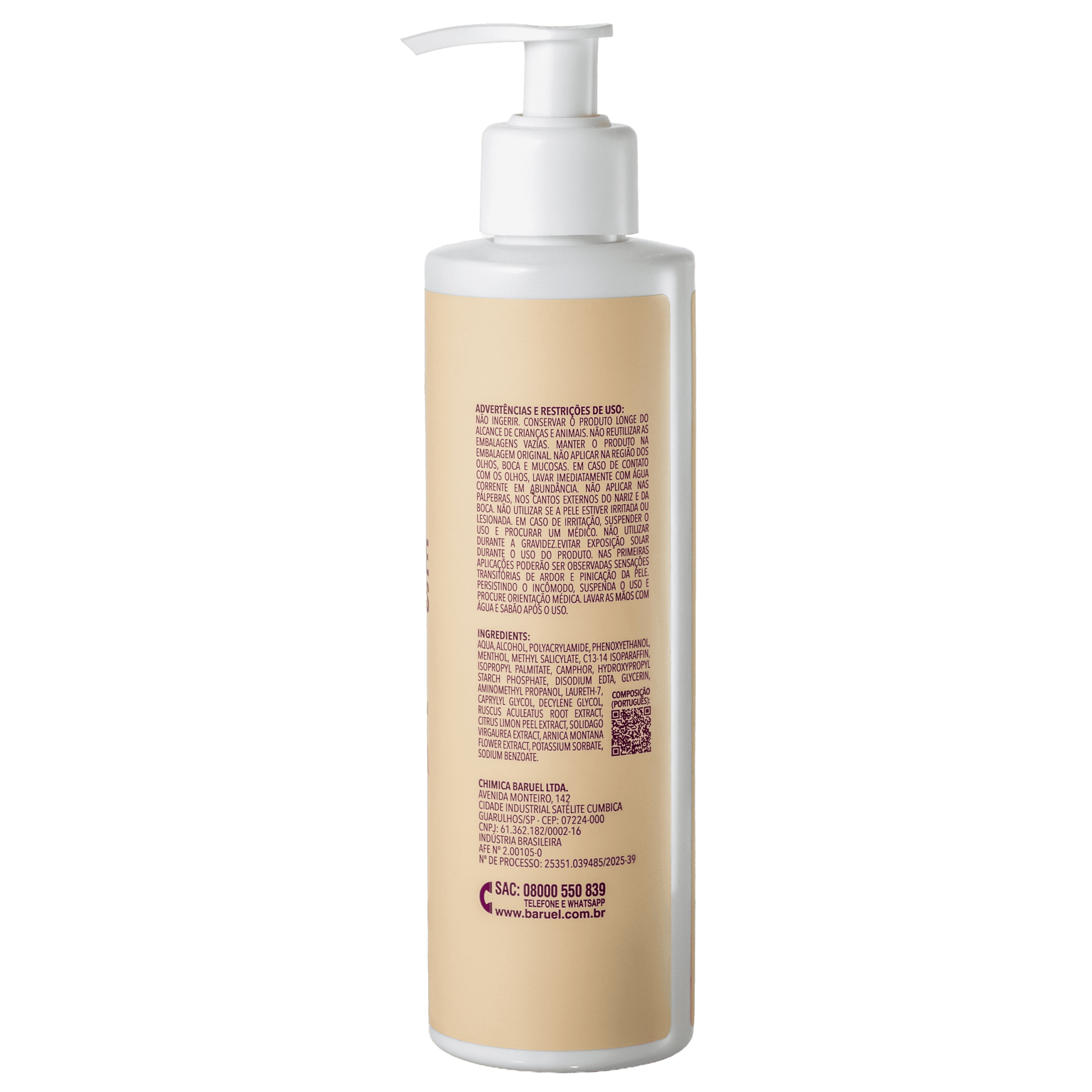 ÁGUA, ÁLCOOL ETÍLICO, POLIACRILAMIDA, FENOXIETANOL, MENTOL, SALICILATO DE METILA, ISOPARAFINA C13-14, PALMITATO DE ISOPROPILA, CÂNFORA, FOSFATO DE HIDROXIPROPILDIAMIDO, EDETATO DISSÓDICO, GLICEROL, AMINOMETILPROPANOL, LAUROMACROGOL 400, CAPRILILGLICOL, DECILENOGLICOL, EXTRATO DA RAIZ DE RUSCUS ACULEATUS, EXTRATO DE CASCA DE CITRUS LIMON, EXTRATO DE SOLIDAGO VIRGAUREA, EXTRATO DA FLOR DE ARNICA MONTANA, SORBATO DE POTÁSSIO, BENZOATO DE SÓDIO.